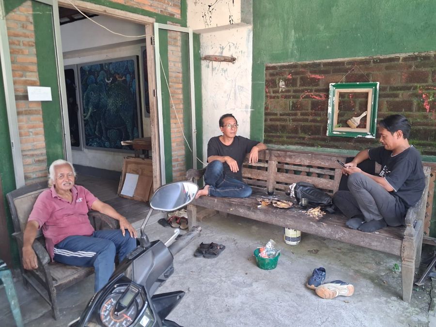 Di teras Galeri Admojo, Tuksongo, siang itu tidak ada yang tampak serius setidaknya di permukaan. Tiga lelaki duduk santai: satu bersandar di kursi tua dengan wajah penuh pengalaman, satu lagi setengah selonjor di bangku panjang yang mulai kropos, dan satu lainnya sibuk dengan gayanya sambil sesekali nyengir sendiri. Di depan mereka, kopi tinggal separuh, kacang rebus berserakan, pisang godog mulai dingin seolah ikut mendengar obrolan yang makin lama makin “matang”.
